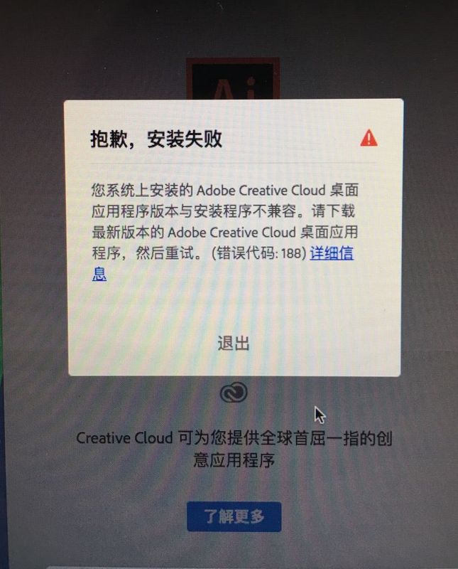 这个是由于你的电脑中之前安装了低版本的Adobe软件,还有低版本的creative cloud存在,需要安装一个新版本的creative cloud,我们已经准备好了最新的creative cloud(请下载文章最下方附件),如果遇到此问题的朋友,只需要打开安装最新版的creative cloud,然后再安装即可。