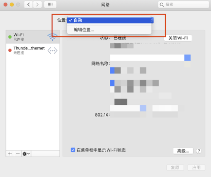 2、在“系统偏好设置”里打开“网络”,在标记为“自动”的位置上点击,然后选择“编辑位置”,并在弹出的窗口中点击“+”号来添加一个新的网络位置,重启 Mac。